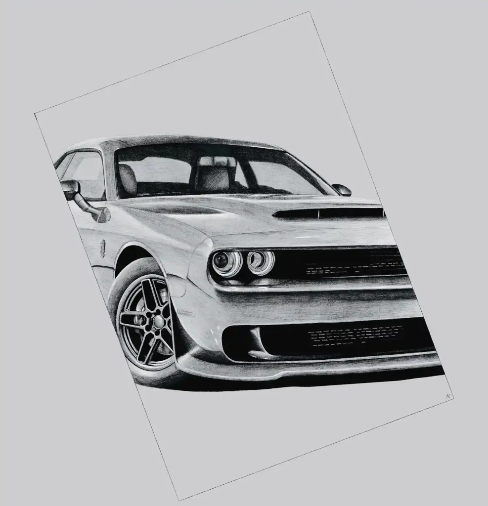 This graphite drawing perfectly captures the raw power and aggressive presence of an American muscle car. The artist uses deep, rich blacks and sharp highlights to define the car’s bold lines and intimidating front fascia. Every detail, from the iconic quad headlights to the complex wheel design, is rendered with precision, creating a truly formidable portrait.