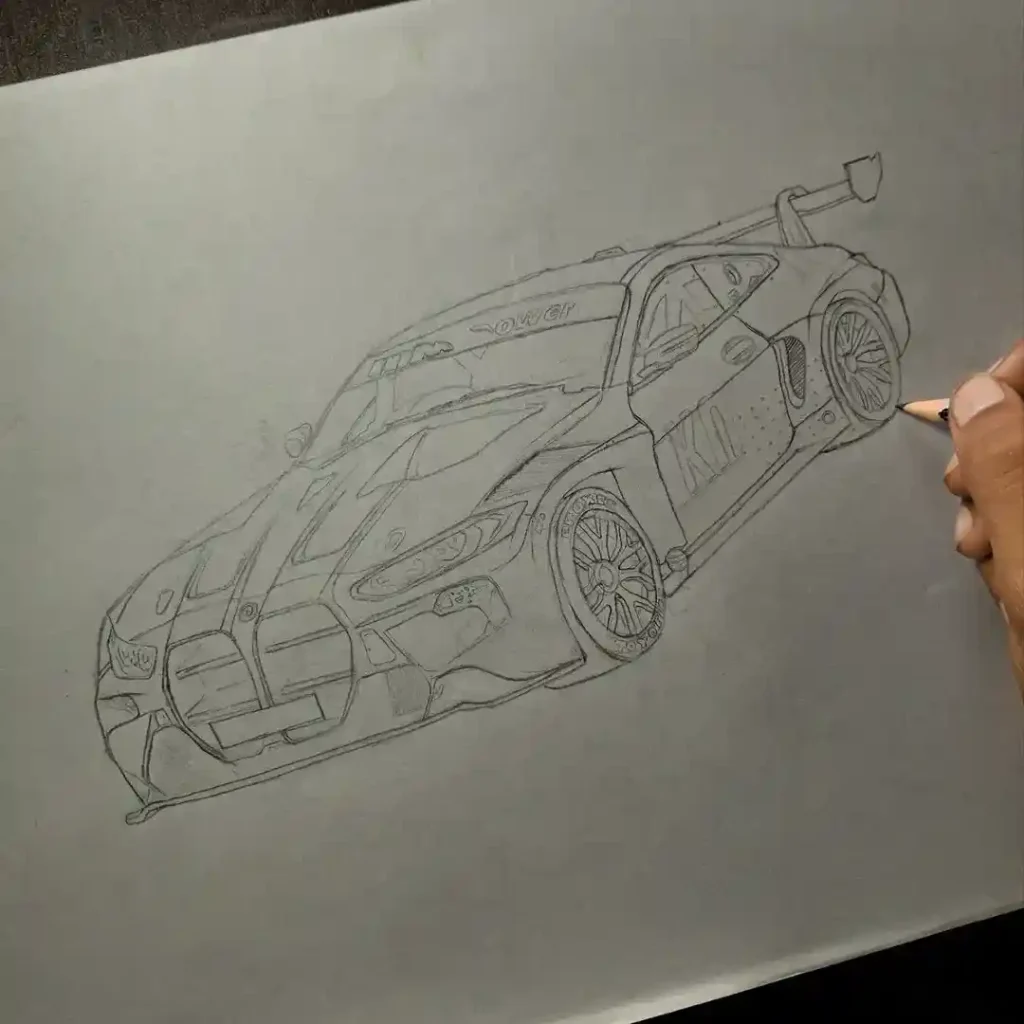 Every great drawing starts with a solid foundation, and this line art is exceptional. The artist has meticulously laid out the complex form of a modern GT race car, capturing every aerodynamic detail from the massive wing to the aggressive front splitter. This clean pencil work on toned paper isn’t just an outline; it’s the blueprint of a beast.