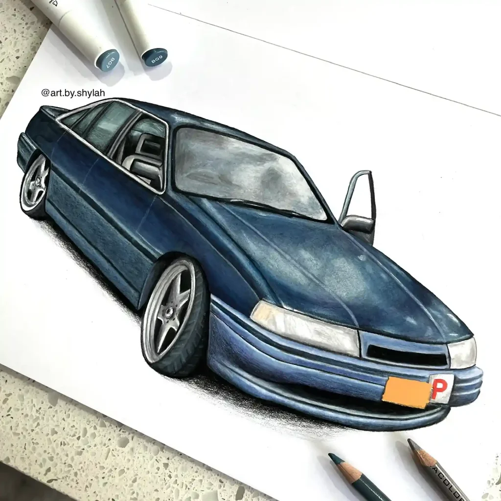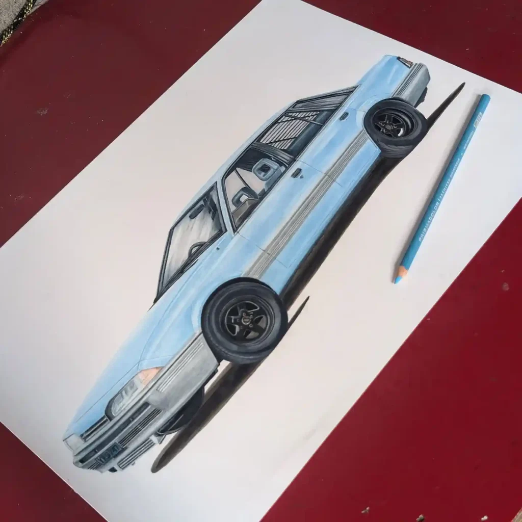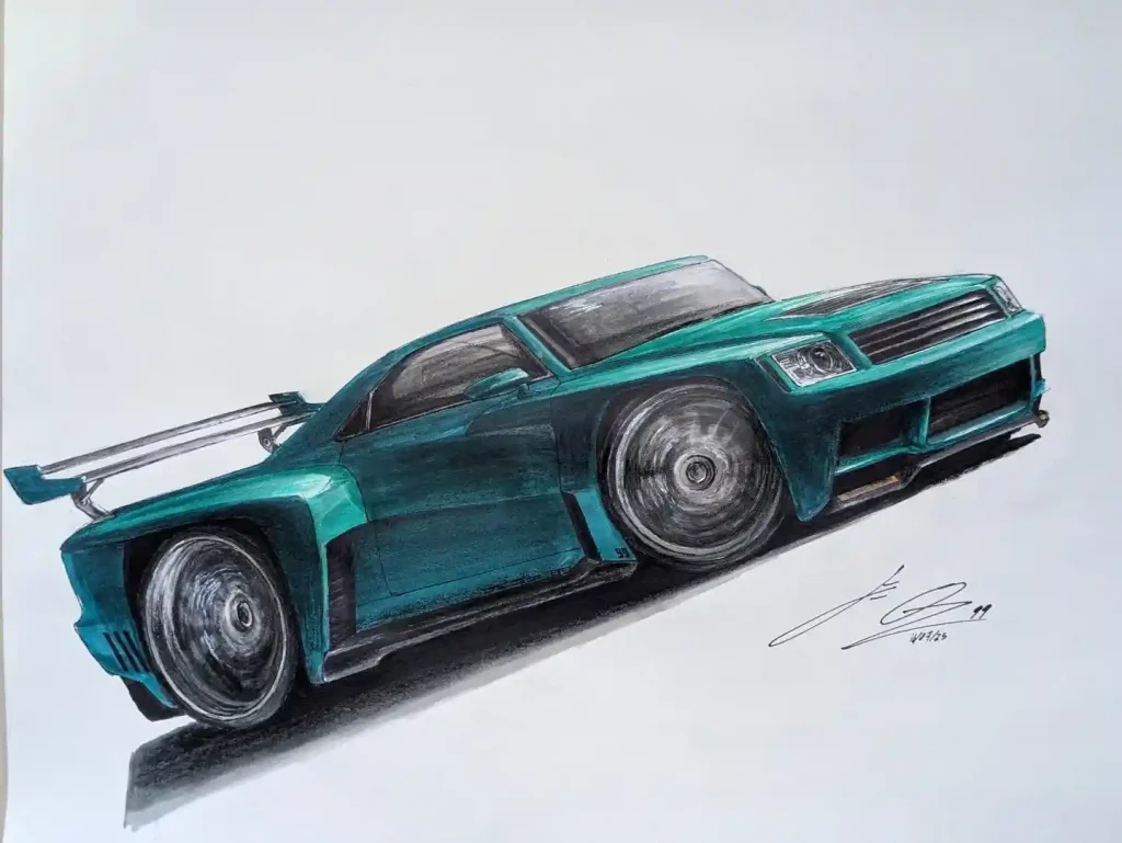 This drawing perfectly captures the essence of everyday car culture. The artist uses a mix of markers and pencils to give the classic sedan’s blue paint a realistic, textured sheen. Details like the open door and the learner plate add a slice-of-life authenticity, making this a relatable and skillfully rendered tribute to a beloved modified car.