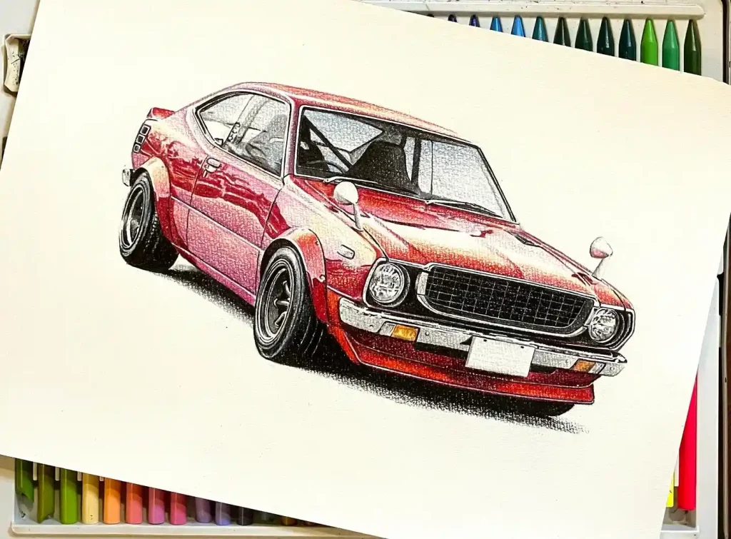 What a unique and stunning artistic style! The artist has rendered this classic Japanese sports coupe using a pointillist-like technique with what looks like oil pastels or wax crayons. This method creates a vibrant, shimmering texture that beautifully captures the reflections in the car’s cherry-red paint. A truly original and eye-catching piece of automotive art.