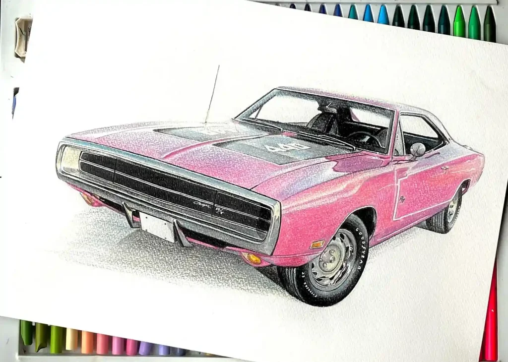 You can’t get much bolder than Mopar’s “Panther Pink,” and this drawing does it justice. This piece beautifully captures the iconic lines of a classic Dodge Charger in one of its most famous colors. The artist’s meticulous colored pencil work gives the paint a textured, almost sparkling quality, celebrating a true legend of American muscle.