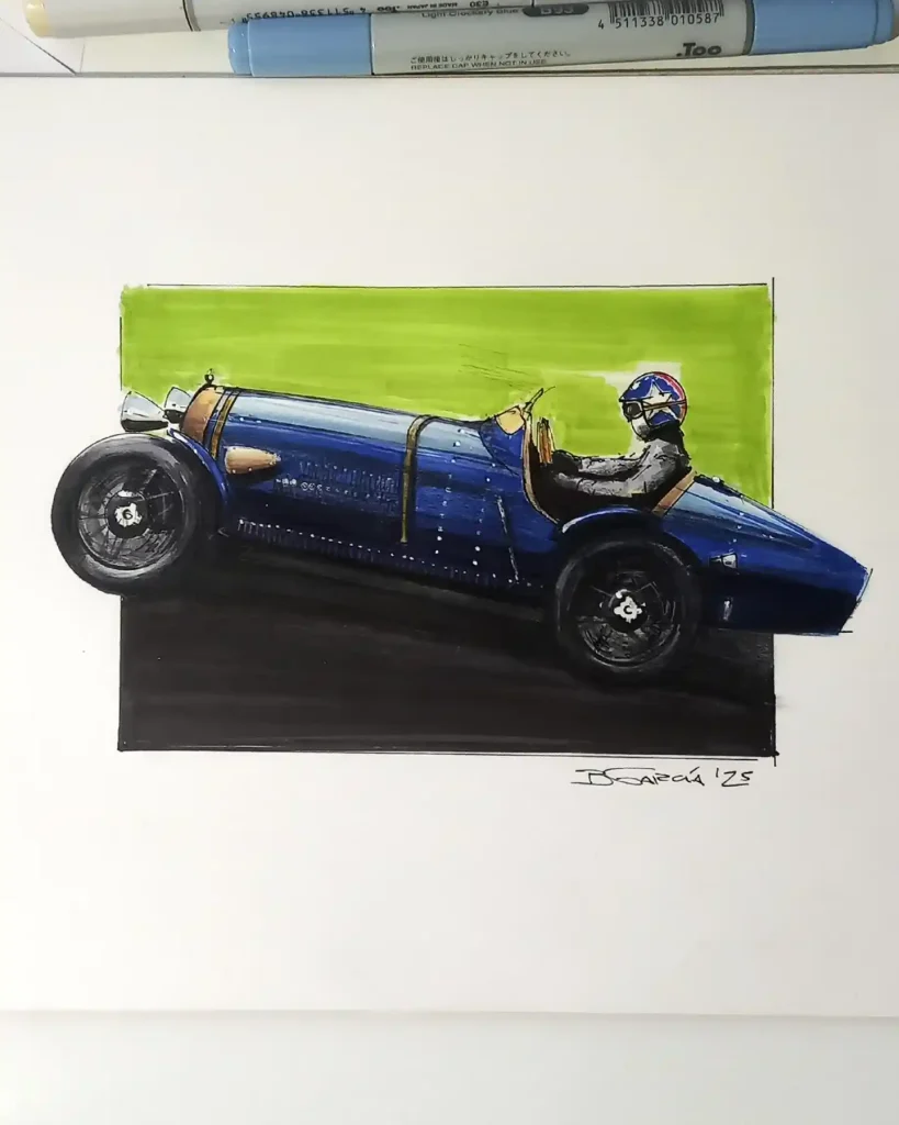 A beautiful rendering that transports us back to a bygone era of motor racing. The artist uses alcohol markers with a classic, illustrative style to capture the long, elegant form of a vintage Bugatti Grand Prix car. The simple color blocking in the background makes the iconic French Blue pop, perfectly celebrating the beauty and bravery of early motorsport.