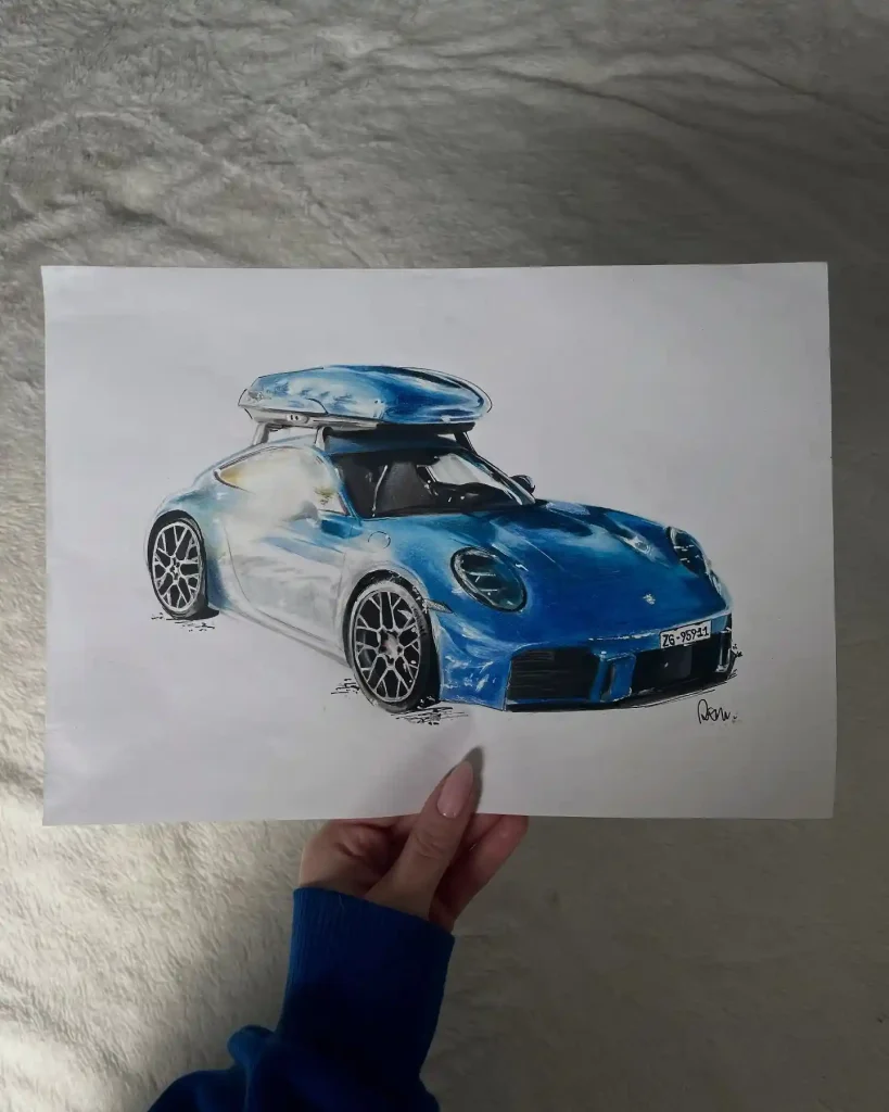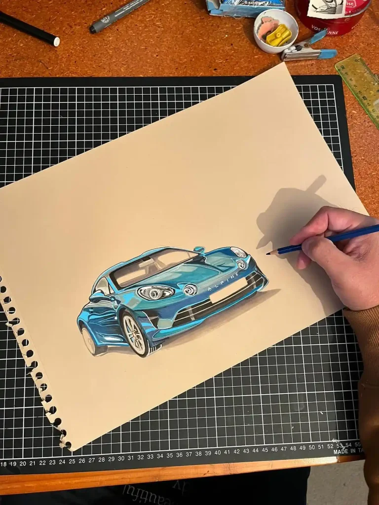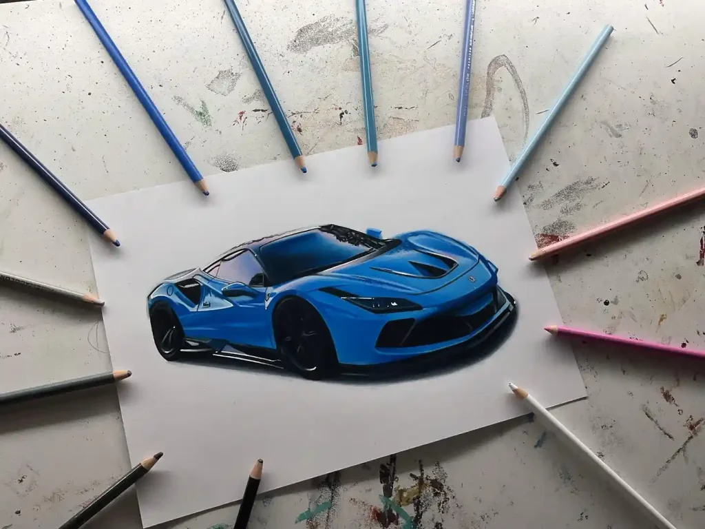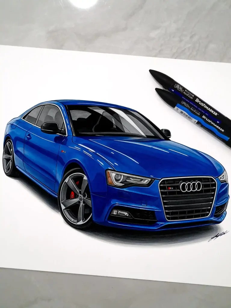 The reflections in this piece are absolutely flawless. The artist uses a combination of markers and pencils to give the car’s electric blue paint a liquid-smooth, showroom finish. Every curve and highlight is captured perfectly, creating a sense of depth that makes the car look three-dimensional. A stunning example of modern, realistic automotive art.