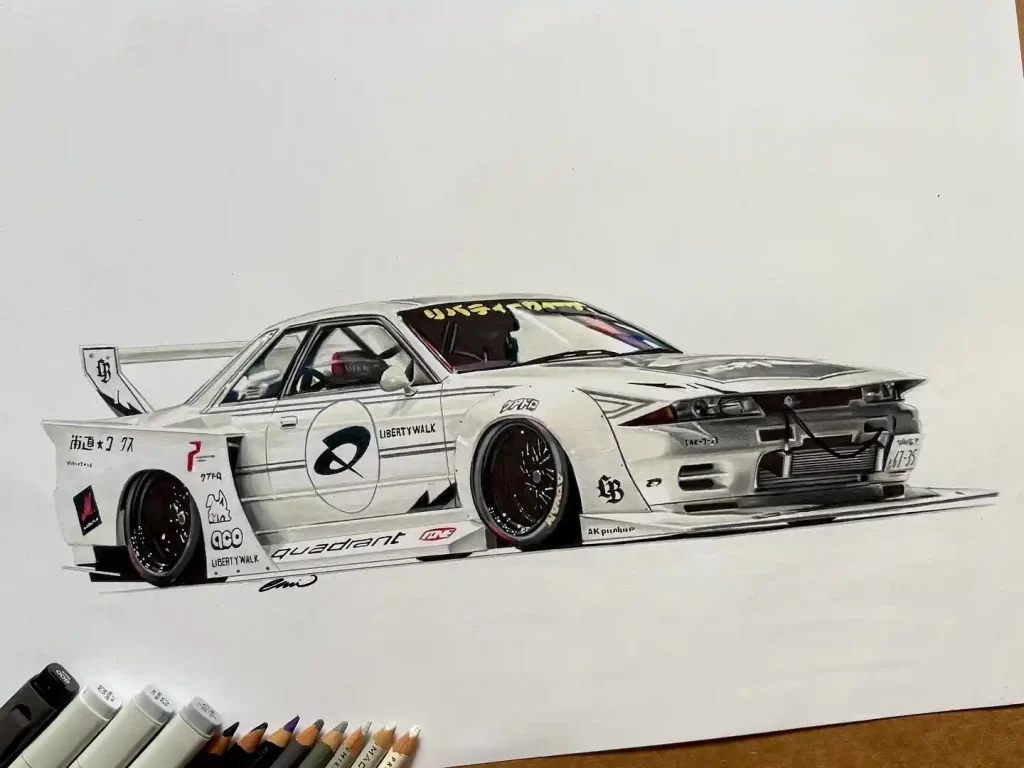 This is a jaw-dropping rendition of a full-blown “Silhouette” style race car. The artist has perfectly captured the insane details of the Liberty Walk widebody kit, from the massive front splitter to the intricate livery. The mix of markers and pencils creates a clean, hyper-detailed look that celebrates the most extreme side of Japanese car culture.