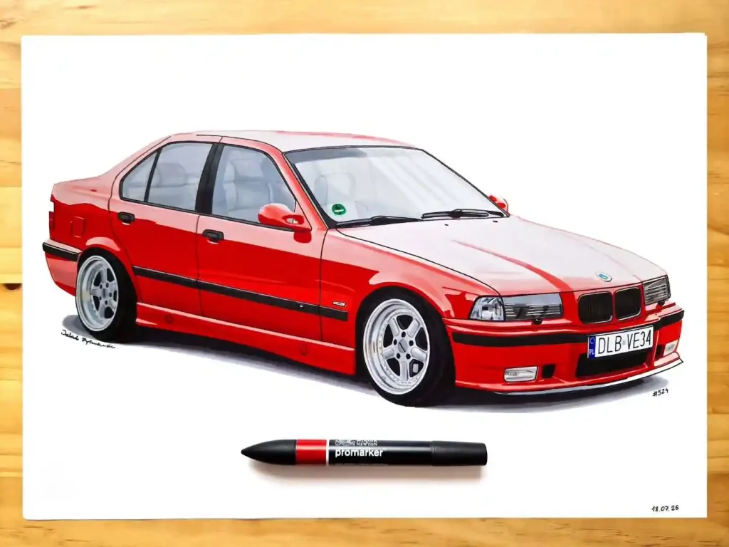 Sometimes, a clean and simple style is the most effective. This marker drawing of a classic European sedan is a perfect example of crisp, illustrative work. The artist has captured the car’s iconic lines with a vibrant red finish and perfect reflections. The lowered stance and deep-dish wheels give this clean classic a subtle but confident modern attitude.