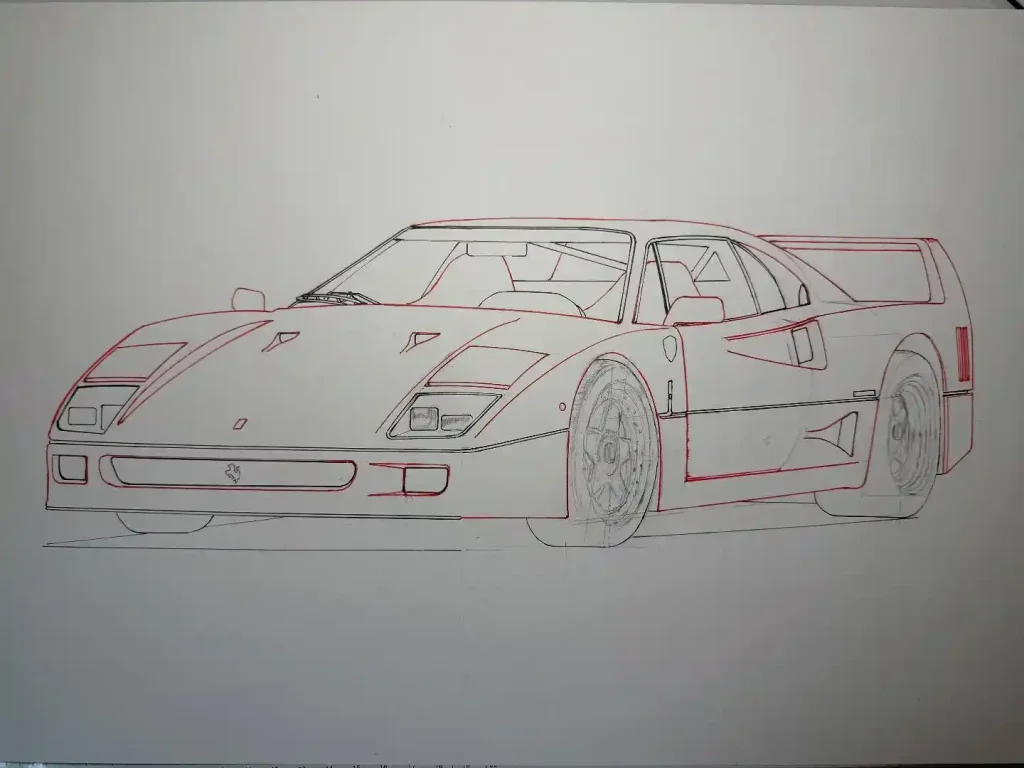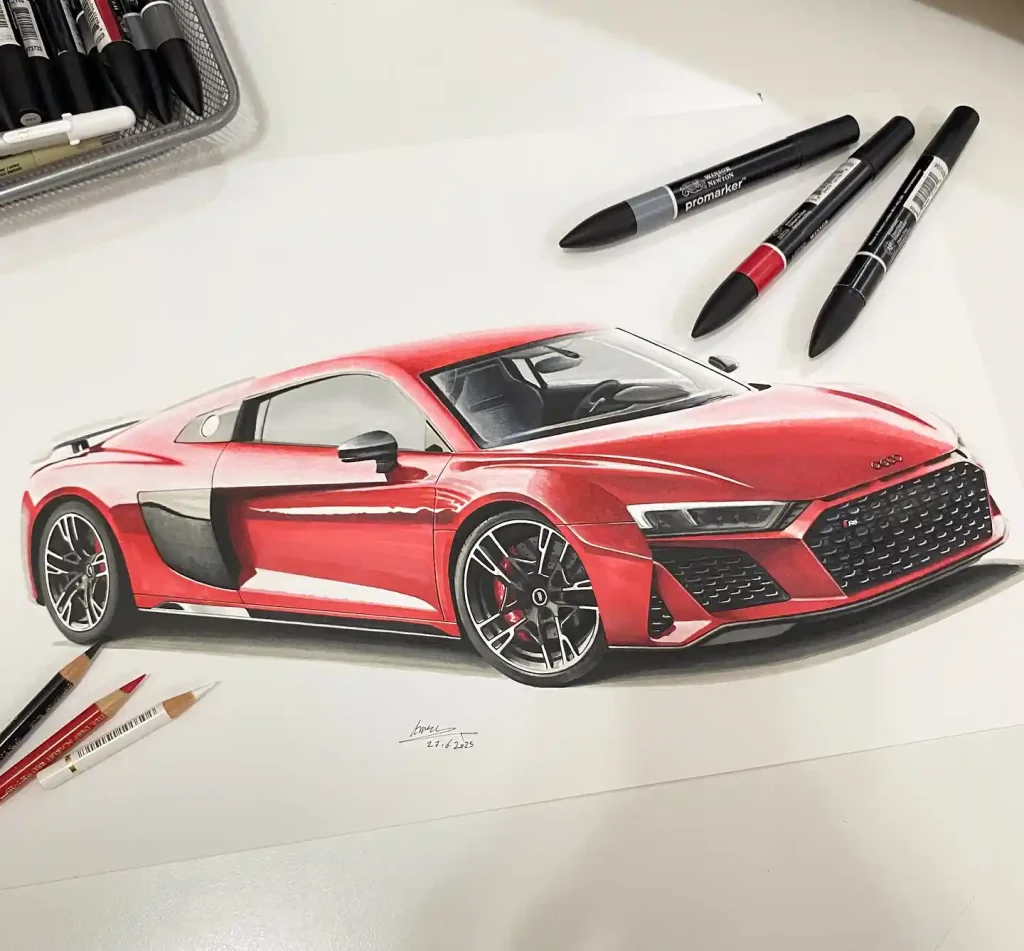 The combination of alcohol markers and colored pencils is perfect for achieving this kind of vibrant, flawless finish. The artist has laid down a stunning scarlet red base, then used pencils to add crisp details and realistic reflections. Every line, from the sharp headlights to the intricate honeycomb grille, is rendered with precision, capturing the car’s exotic beauty.