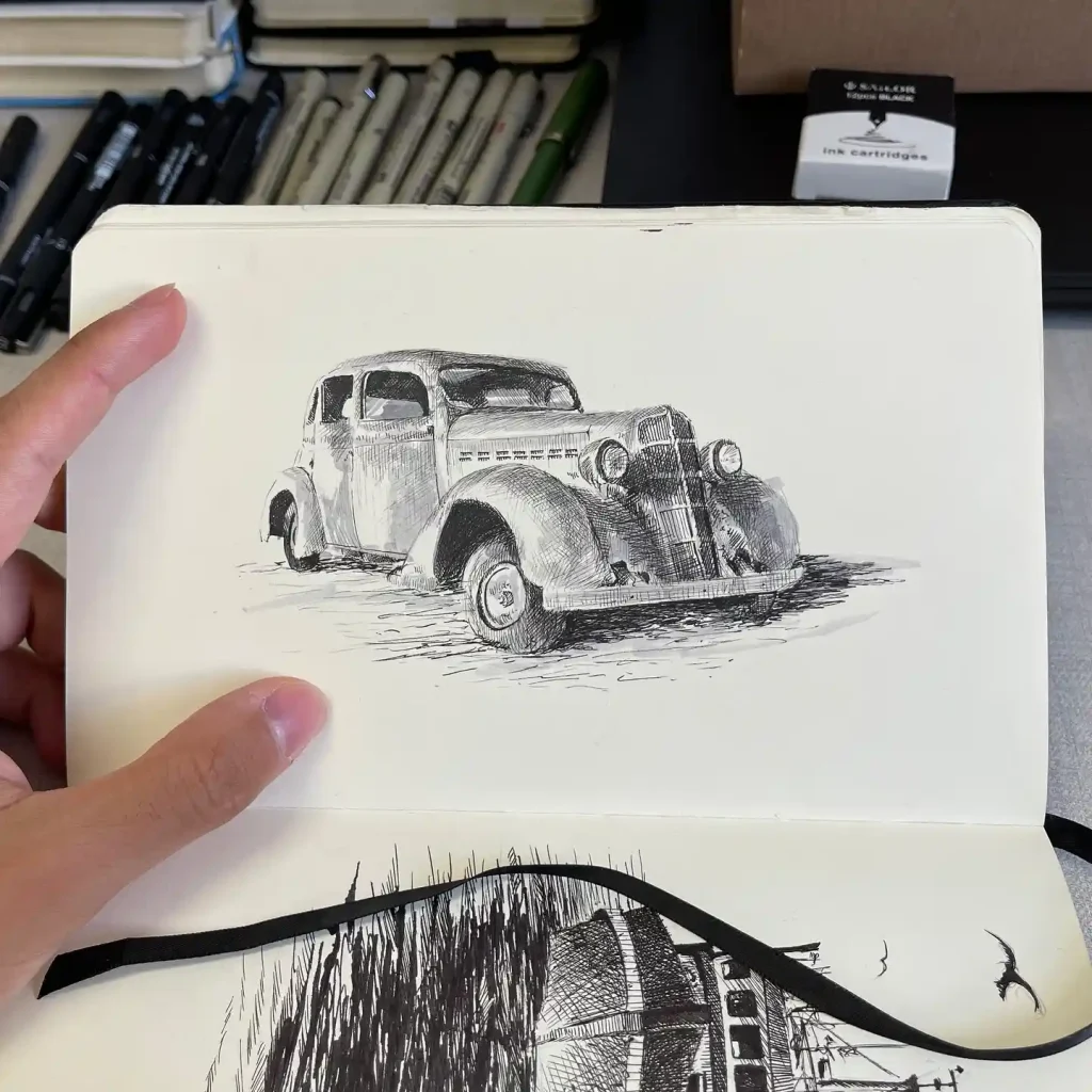 • Texture with cross-lines: Hatch patterns on chrome and leather seats to mimic age; this method sharpens detail work, helping experienced artists express nostalgia and craftsmanship in every line.
