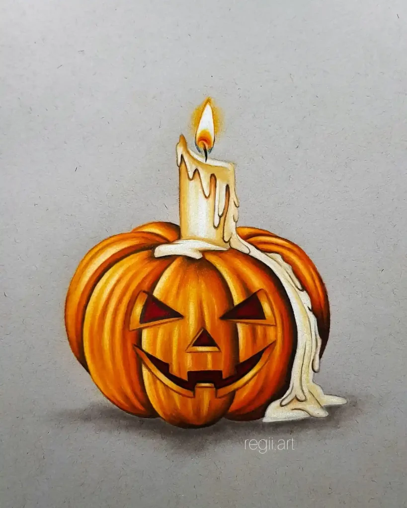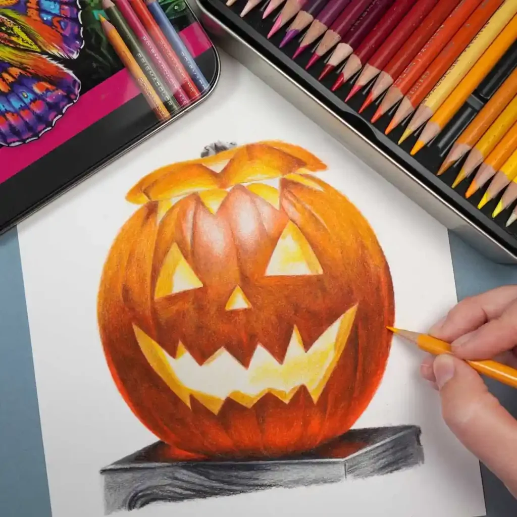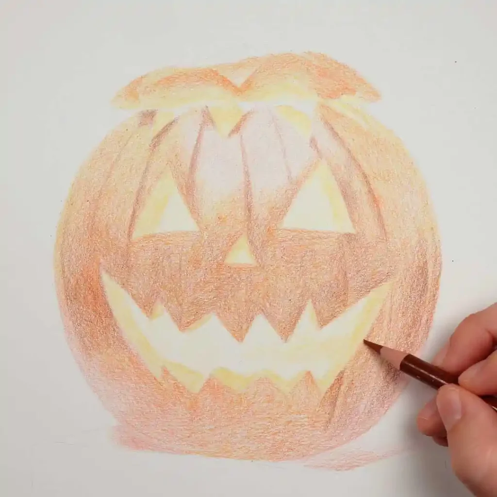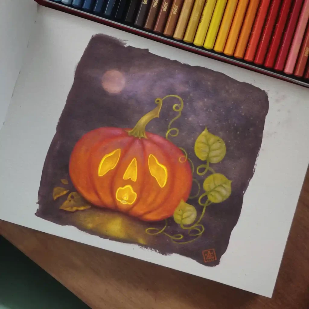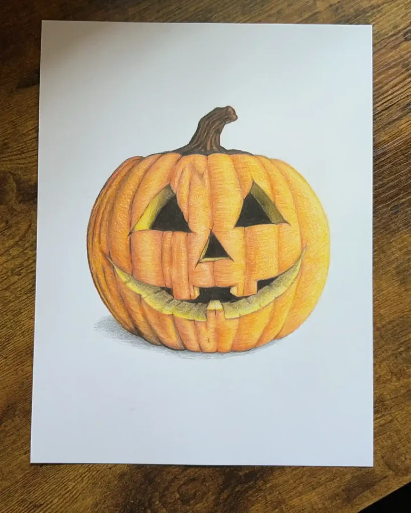 This is a great look at the process of creating that classic jack-o’-lantern glow. Using soft layers of colored pencil, the artist builds up the light from the inside out. The gentle blending of warm yellows and oranges gives the carved face a soft, luminous quality, making the pumpkin look like it’s truly lit from within.