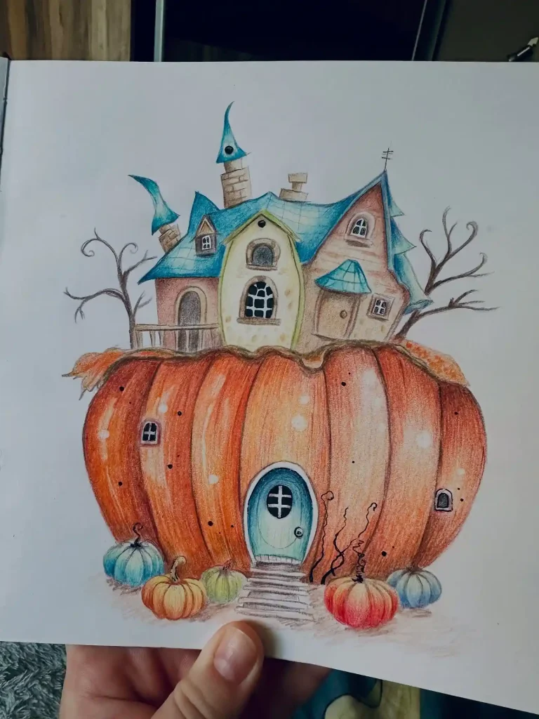 A whole world exists in this single pumpkin. This enchanting colored pencil illustration reimagines a giant gourd as the foundation for a whimsical, fairytale village. The charming, crooked houses with their glowing windows invite you into a magical story. It’s a beautifully imaginative piece that transforms a simple autumn symbol into a land of fantasy.