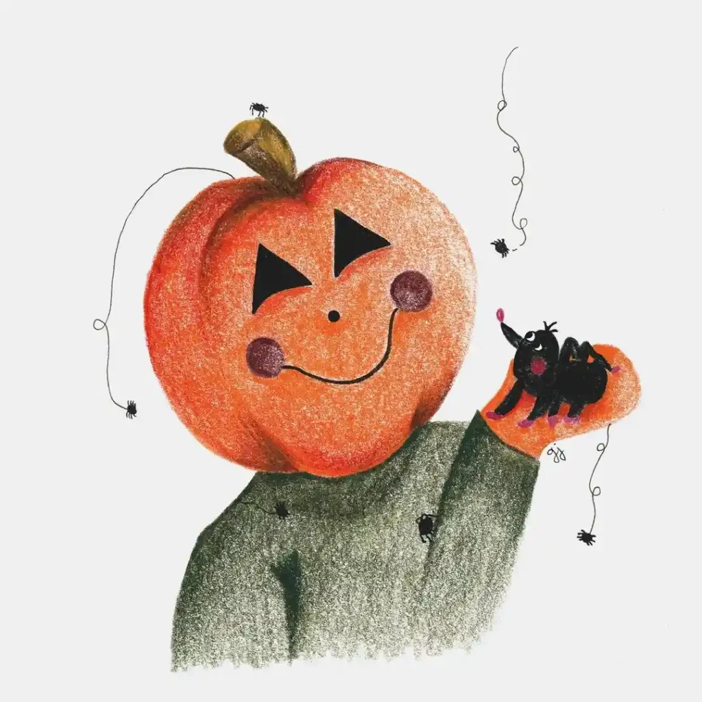 There is such a gentle, storybook quality to this drawing. The soft texture of the colored pencils gives the friendly pumpkin-headed figure a warm and approachable feel. Instead of being scary, the tiny spiders are depicted as curious friends, creating a sweet and whimsical scene that celebrates the kinder, more magical side of the autumn season.