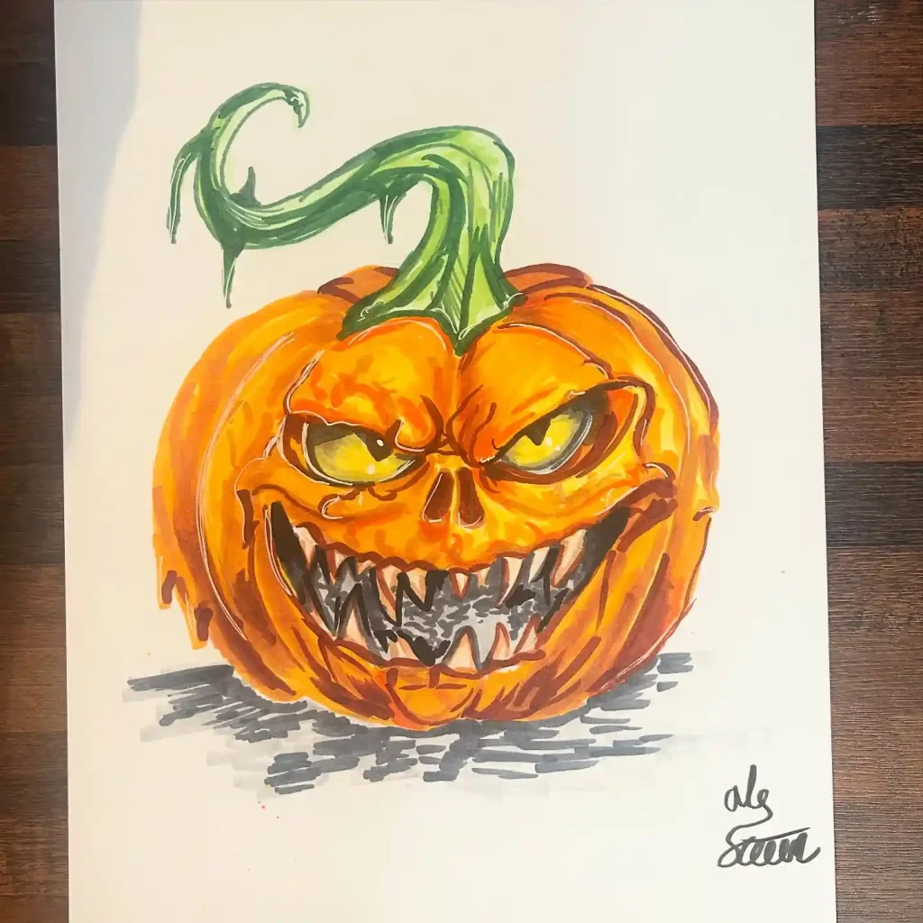This marker drawing is pure Halloween intensity. The artist uses bold ink lines and vibrant, layered marker colors to create a truly menacing character. With its glowing yellow eyes, a mouthful of sharp, grimy teeth, and a twisted, dripping stem, this jack-o’-lantern feels less like a decoration and more like a monster ready to pounce.