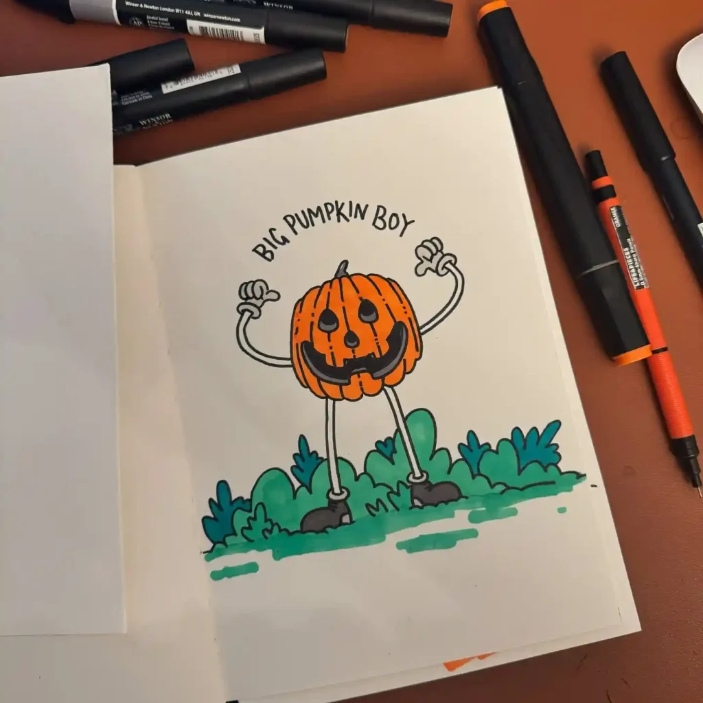 Inspired by classic rubber hose animation, this marker drawing is full of cheerful energy. The happy pumpkin character, with its stick-like limbs and expressive pose, looks ready to dance its way through the season. The bold, clean lines and simple, flat colors give it a fun, retro vibe that’s impossible not to smile at.