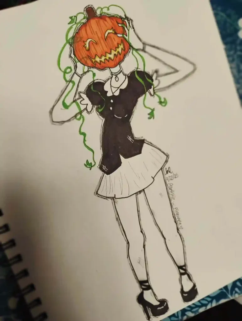 What a cool character design concept! This sketchbook drawing fuses a classic jack-o’-lantern with a stylish, modern character. The green vines wrapping around the figure like hair create a beautiful, organic contrast with the chic dress and platform heels. It’s a wonderfully imaginative take, perfect for anyone who loves both fashion and Halloween.