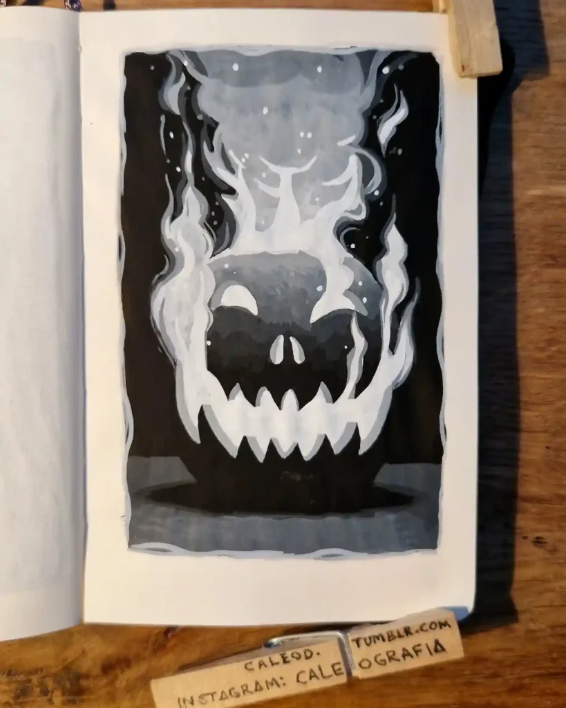 This high-contrast piece is absolutely haunting. Using what looks like opaque gouache on a dark background, the artist depicts a jack-o’-lantern’s soul escaping as ethereal white flames. The simple, ghostly shapes within the smoke add another layer of mystery. It’s a powerful and atmospheric image that feels both spooky and deeply spiritual.
