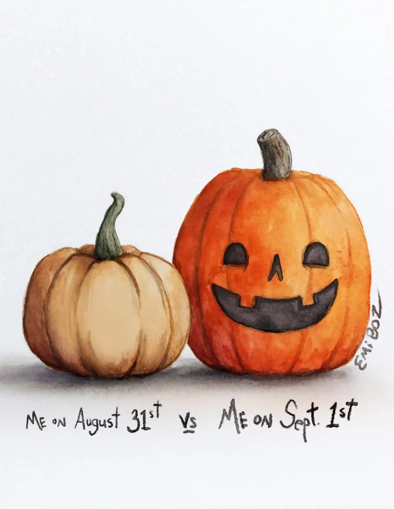 Capturing a whole mood in one simple image, this watercolor painting is so relatable. It perfectly illustrates that switch in feeling as summer ends and the autumn season begins. The soft, muted tones of the first pumpkin transform into the bright, cheerful glow of the second, beautifully representing the joy and anticipation that Halloween lovers feel.