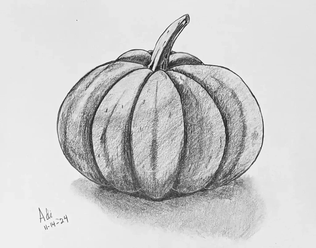 Before the carving comes the classic form. This beautiful graphite drawing is a fantastic study of a natural pumpkin. The artist’s skillful shading perfectly captures the deep ribs and rounded volume of the gourd, while a soft cast shadow grounds it in space. It’s a testament to how compelling a simple, realistic subject can be.
