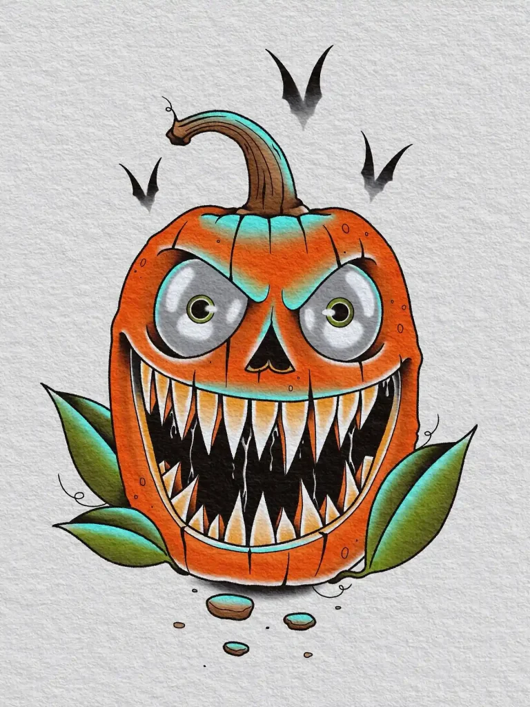 Drawing inspiration from New School tattoo art, this digital piece is bursting with exaggerated style. The pumpkin features massive, crazed eyes, a jaw packed with viciously sharp teeth, and a vibrant, high-contrast color palette with those cool teal highlights. It’s a bold, dynamic, and aggressive design that would look right at home in a tattoo artist’s portfolio.