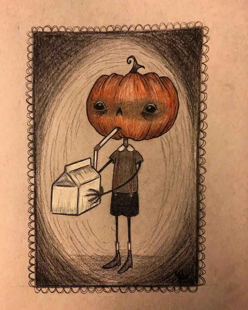 This drawing has such a wonderfully unsettling, storybook feel. The surreal image of a spindly pumpkin-headed boy sipping from a milk carton is both creepy and endearing. Rendered with colored pencils on toned paper, the piece has a vintage, melancholic quality, framed by a dark, textured border that pulls you into its strange little world.