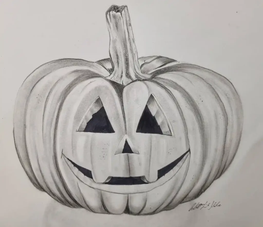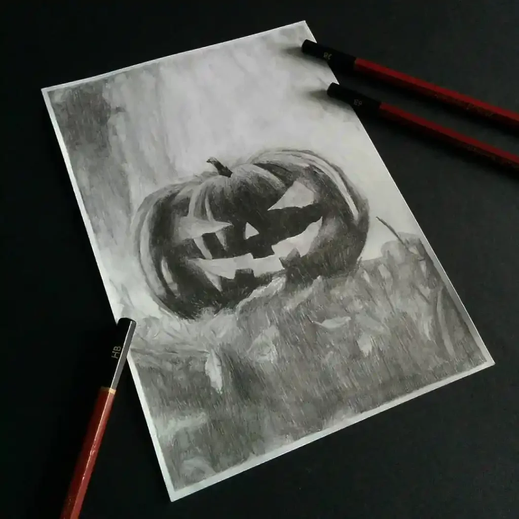 Here is a masterful example of realistic graphite work. The artist has expertly captured the natural form of a carved pumpkin, with each rib and groove carefully shaded to create a convincing three-dimensional effect. The deep, dark spaces of the eyes and mouth provide a stark contrast, showcasing a fantastic understanding of light, shadow, and texture.