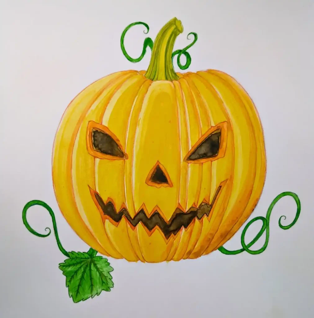 The colors in this piece are just electric. This watercolor or marker illustration pops off the page with its bright, sunny yellows and deep oranges, giving the sinister jack-o’-lantern a lively energy. The whimsical, curling green vines frame the pumpkin perfectly, adding a touch of playful life and movement to the classic spooky face.