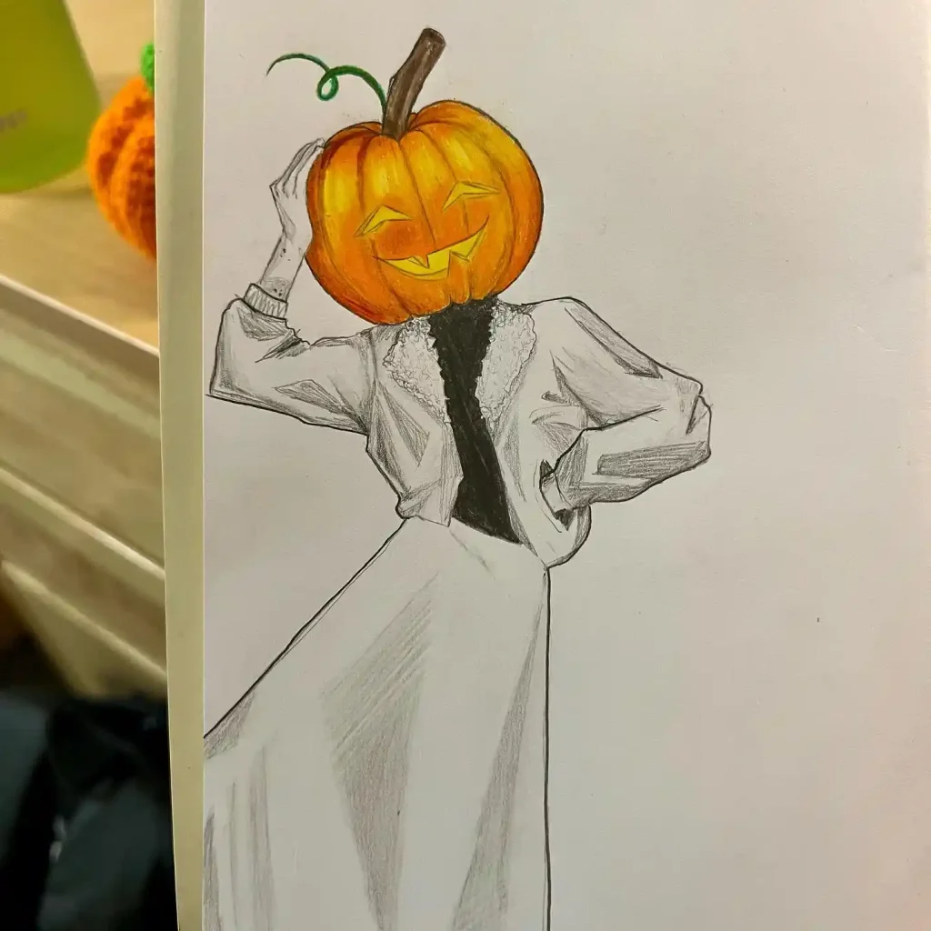 This piece blends Halloween whimsy with classic fashion illustration. The character’s pose is full of elegance and confidence, while the bright, cheerful pumpkin head adds a surreal and playful twist. Using color only for the head is a smart choice, making it the undeniable focal point of this stylish and unique autumn-themed character design.