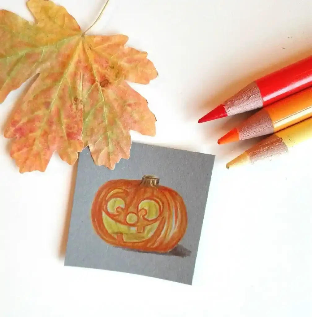 What a delightful little miniature masterpiece. Drawn on a small square of toned paper, this tiny jack-o’-lantern shines like a little autumn jewel. The colored pencils pop beautifully against the gray background, and the artist has managed to pack so much detail and personality into the swirly, smiling face. It’s a perfect little burst of color.
