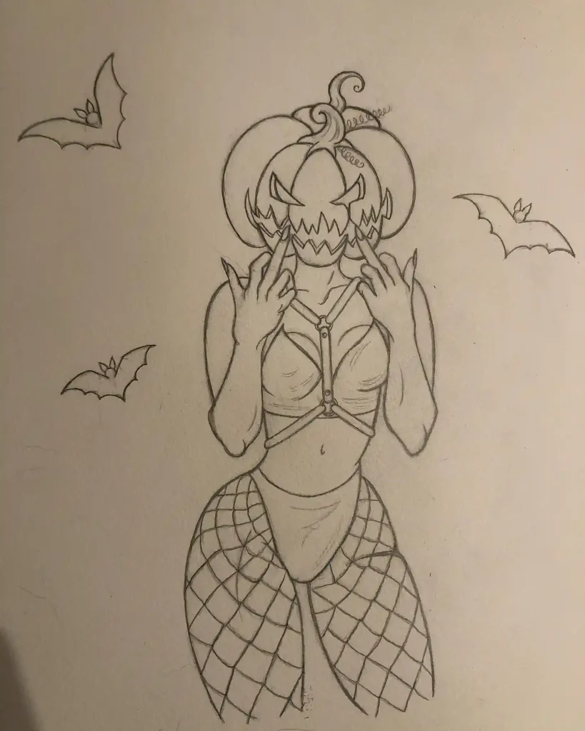 This character sketch combines spooky Halloween vibes with a bold, edgy attitude. The monstrous, sharply carved pumpkin head provides a fantastic contrast to the confident, powerful pose of the figure. With details like the intricate harness and fishnets, this pencil drawing creates a unique and empowered “pumpkin goddess” character that feels both dangerous and alluring.