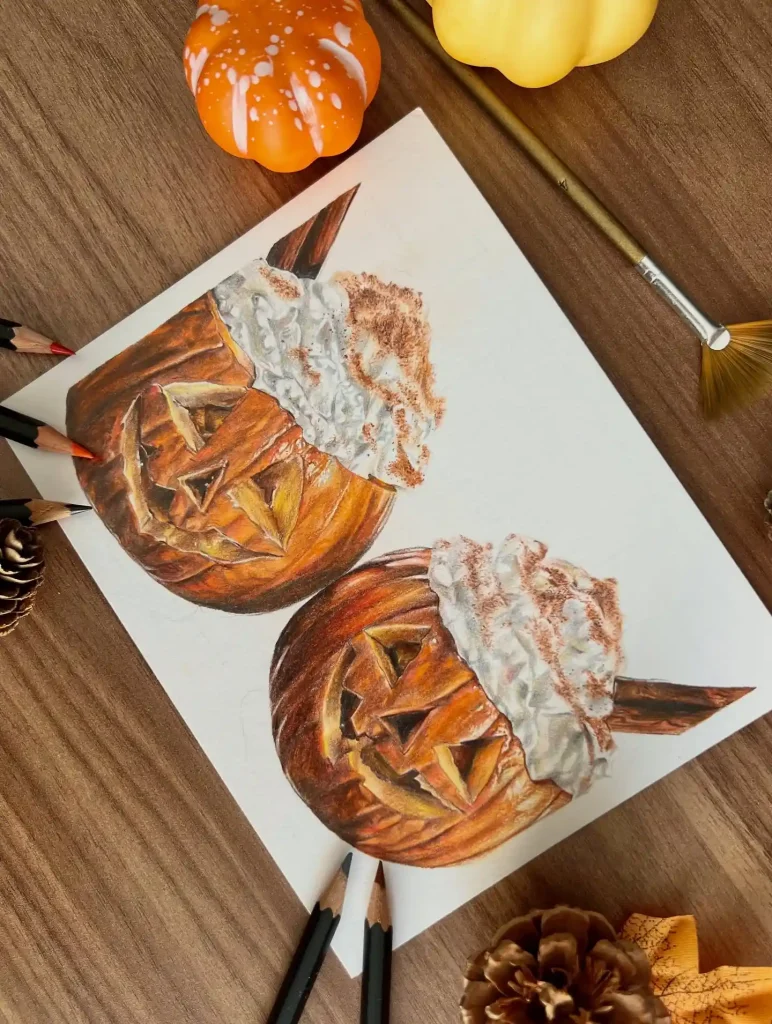 What a delicious and creative idea! This colored pencil artwork brilliantly transforms carved pumpkins into the ultimate autumn beverage. The artist’s attention to detail is incredible, from the rich, warm tones of the pumpkin shell to the fluffy, textured appearance of the whipped cream and sprinkled cinnamon. It’s a perfect blend of spooky and sweet.