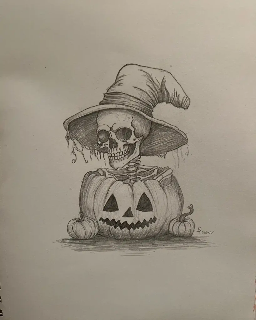 A wonderfully macabre and detailed concept, perfectly rendered in pencil. This drawing depicts a weathered skeleton in a tattered witch hat emerging from inside a jack-o’-lantern. The meticulous shading on the bones and skull gives the piece a fantastic sense of realism and decay, creating a classic, gothic horror scene that is expertly executed.