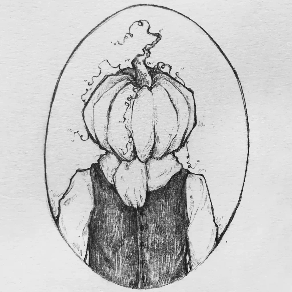 This beautiful graphite sketch has the feel of a vintage photograph or an old-world portrait. By showing the pumpkin-headed figure from behind, dressed in a smart vest, the artist creates an air of mystery and quiet contemplation. The delicate, curly vines and detailed shading on the pumpkin give it a classic, gothic charm that is truly captivating.