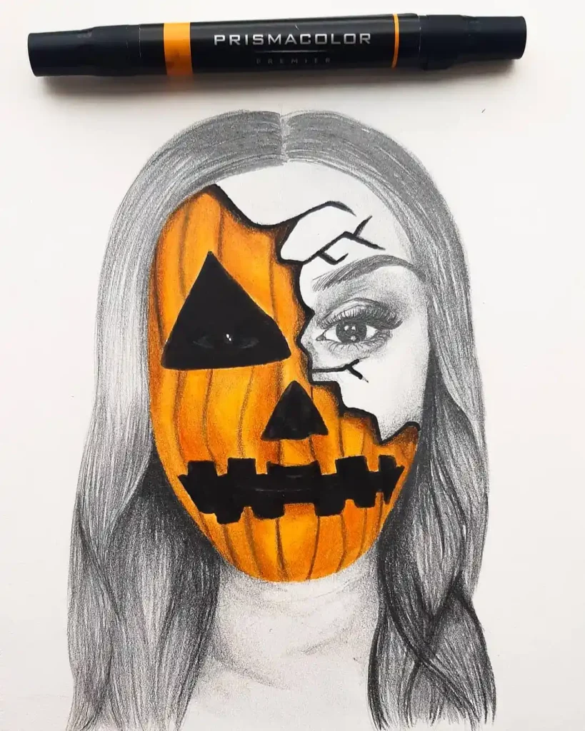 This mixed-media portrait is a stunning piece of surreal art. The artist combines hyperrealistic pencil work with bold, vibrant markers to create a powerful illusion of a shattered pumpkin mask. The contrast between the detailed human eye peeking through and the graphic jack-o’-lantern facade is incredibly striking, exploring themes of identity and hidden selves.