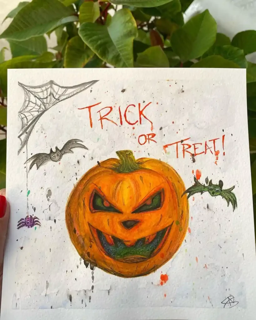 There’s so much raw, chaotic energy in this mixed-media piece. The jack-o’-lantern’s evil grin is brought to life with vibrant, painterly strokes and dynamic splatters. Accompanied by creepy bats and a dangling spider, the whole composition feels spontaneous and wild—a perfect artistic expression of Halloween’s mischievous and spooky spirit.