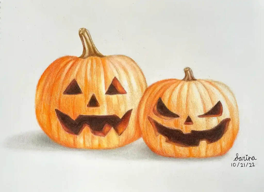 This charming drawing showcases how a few simple cuts can give a pumpkin a whole personality. One jack-o’-lantern looks friendly and classic, while its smaller companion has a mischievous, sneaky grin. The soft, warm application of colored pencils gives them a gentle, approachable texture, creating a delightful scene that perfectly captures the fun of Halloween.