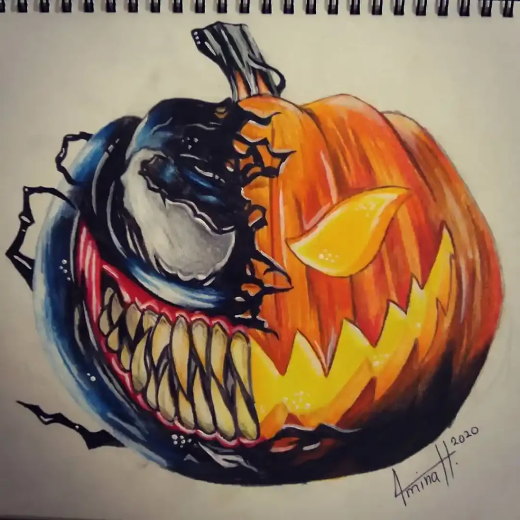 Pop culture mashups are always a blast, and this one is fantastic. The drawing shows a classic jack-o’-lantern being consumed by the iconic Venom symbiote. The contrast between the warm, glowing pumpkin and the dark, sinister alien with its terrifying teeth is brilliantly executed. It’s a creative, edgy, and perfectly creepy concept for any comic fan.