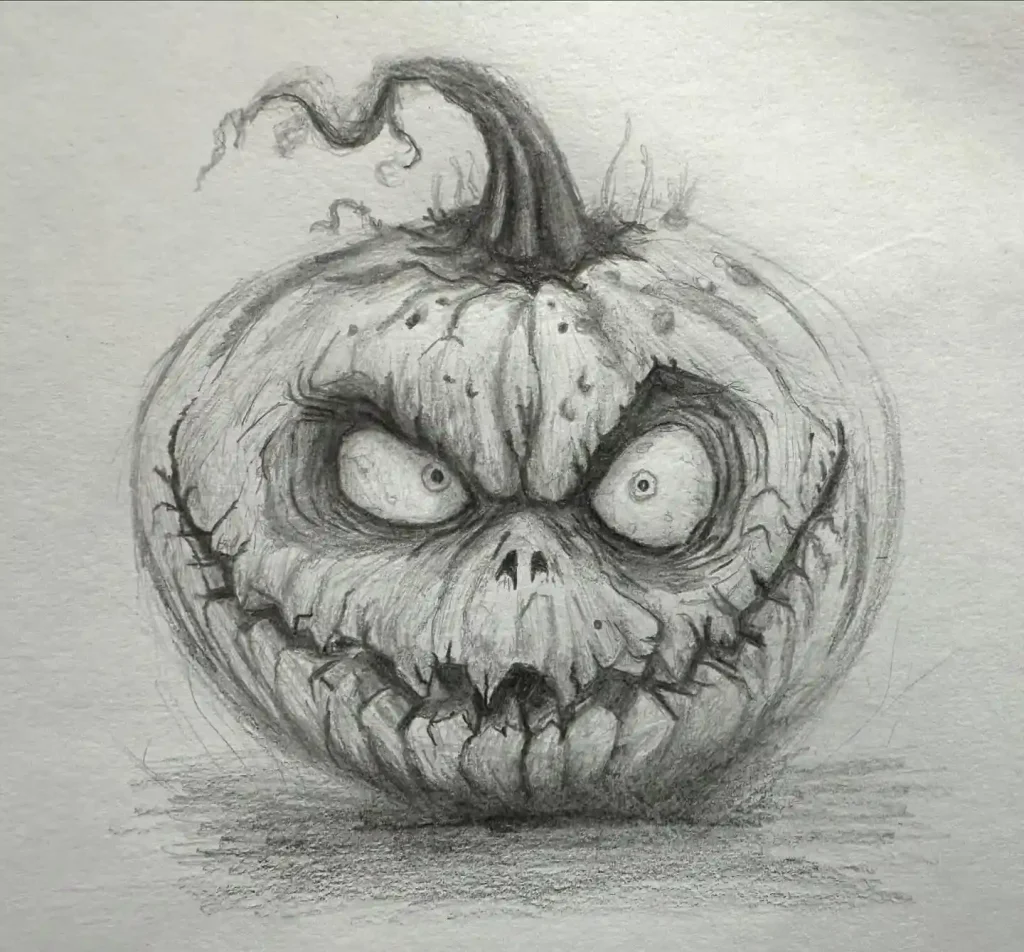 This isn’t just a jack-o’-lantern; it’s a monster. This incredibly detailed graphite drawing transforms a pumpkin into a horrifying creature. The artist has given it a gnarled, wrinkled skin, crazed, staring eyes, and a mouth full of jagged, root-like teeth. The twisted stem completes the monstrous transformation, making it pure nightmare fuel.