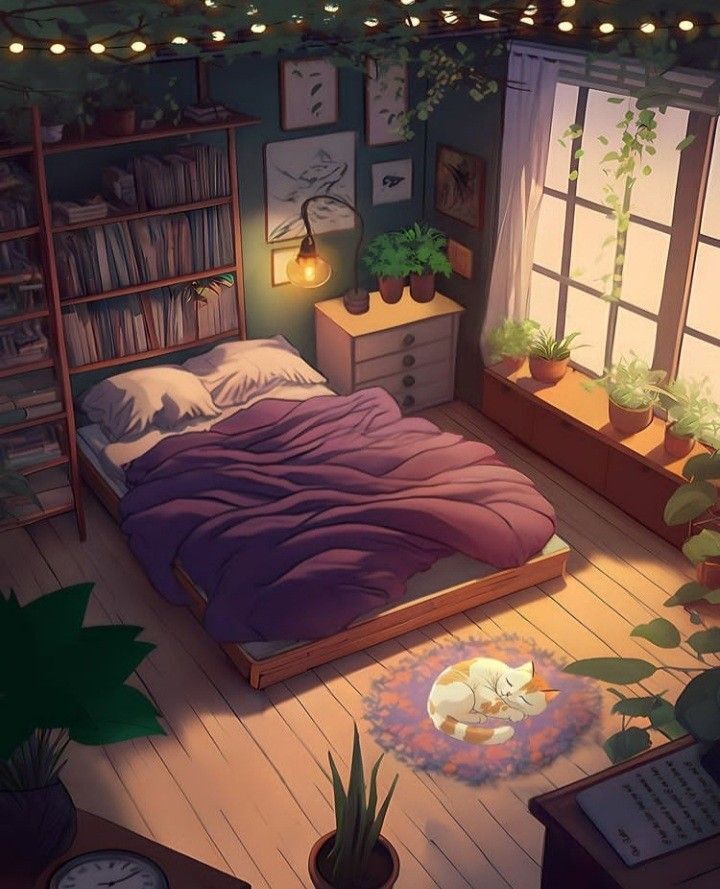 This image depicts a serene bedroom filled with warm lighting, soft bedding, and lush greenery. A cat peacefully sleeps on a colorful rug near the bed, while string lights and plants create a calming atmosphere. The room feels inviting, offering a perfect space for relaxation and comfort.
