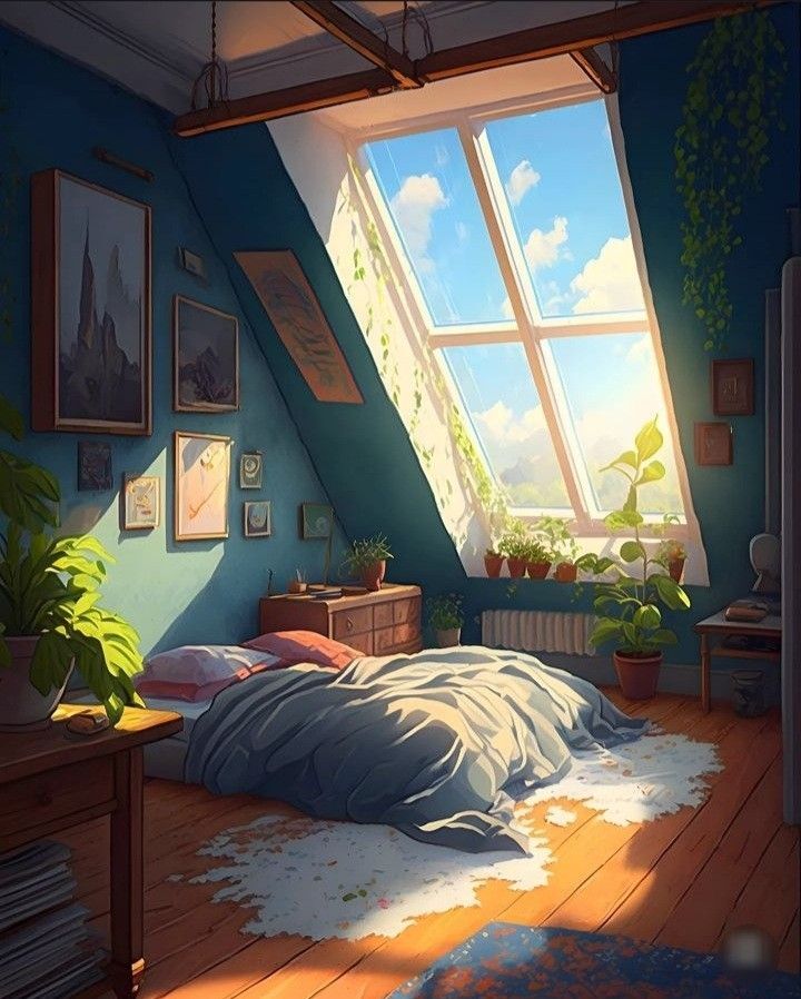 This cozy attic room is bathed in warm sunlight streaming through large skylights, creating a serene and inviting atmosphere. The room is adorned with lush plants, soft bedding, and artistic wall decor, offering a peaceful retreat. The natural light enhances the tranquil and earthy ambiance.