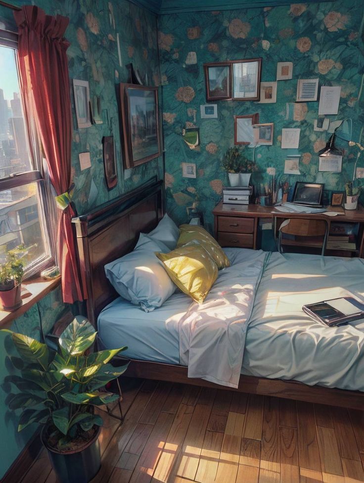 This image depicts a small, cozy bedroom bathed in warm sunlight. The room is adorned with vibrant floral wallpaper, a neatly made bed with soft pillows, and a desk nestled against the wall. The space is filled with personal touches, plants, and framed artwork, creating a peaceful ambiance.