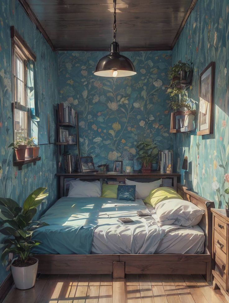 This image showcases a small, cozy bedroom adorned with vibrant floral wallpaper. The room is filled with natural light streaming through the windows, highlighting the lush green plants and wooden furniture. A comfortable bed with soft pillows and blankets invites relaxation, creating a serene and peaceful atmosphere for rest.