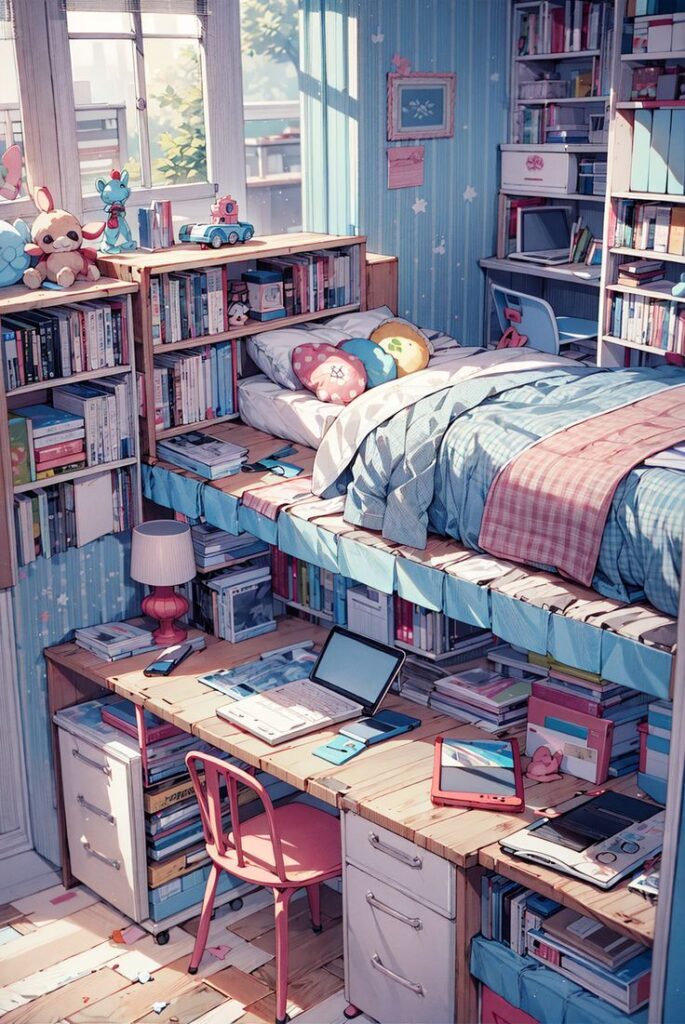 This image depicts a cozy, well-organized study space filled with books, gadgets, and cute plush toys. The room has a warm, inviting atmosphere with soft lighting and pastel tones. The bed is surrounded by shelves, creating a multifunctional area perfect for both studying and relaxing in comfort.