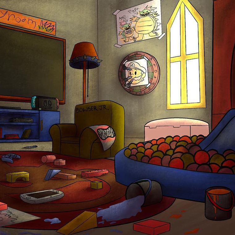 This image depicts a cozy and chaotic playroom belonging to Bowser Jr., a character from the Mario universe. The room is filled with toys, gaming consoles, and a ball pit. Posters of Bowser and Mario decorate the walls, reflecting Bowser Jr.’s admiration for his father and rivalry with Mario.