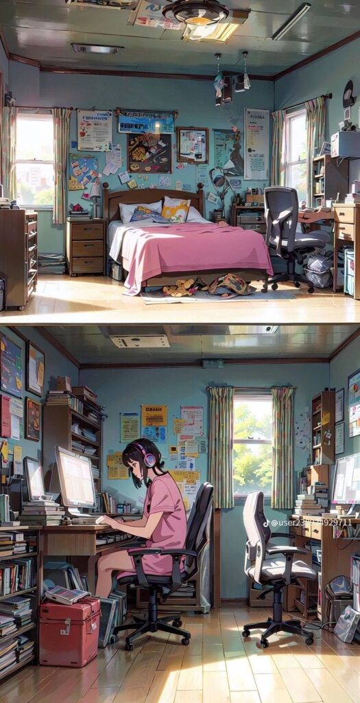 This anime-style image depicts a cozy, cluttered room filled with books, posters, and personal items. The character, wearing headphones, is focused on her work at the desk. The room reflects a balance between relaxation and productivity, with a bed nearby and plenty of natural light streaming through the windows.