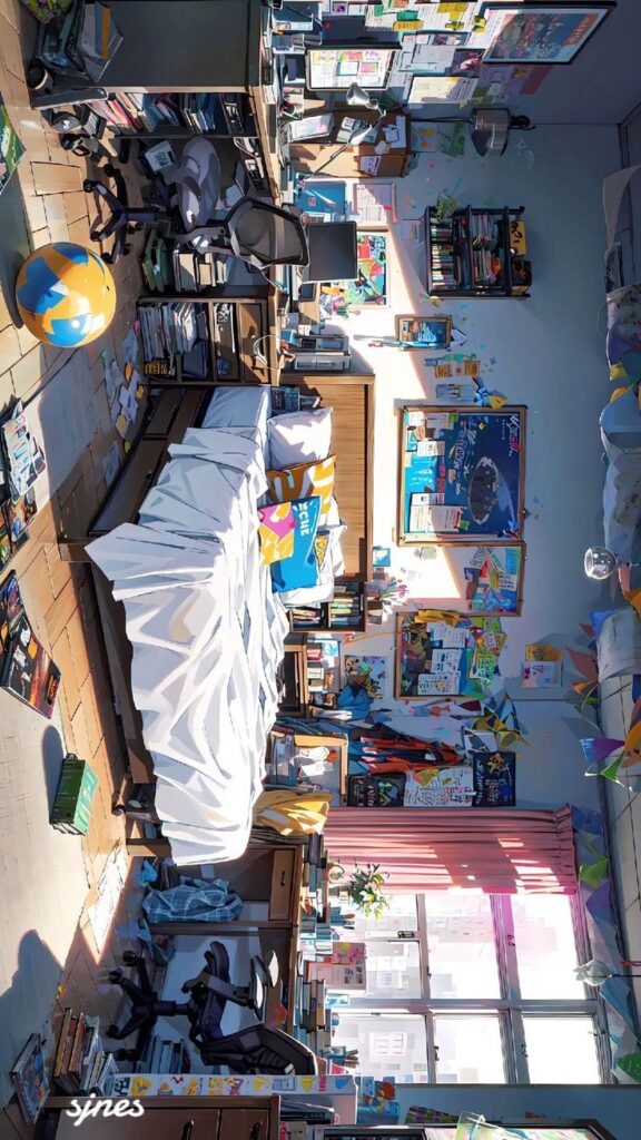 This image depicts a cluttered yet vibrant student dorm room, filled with books, posters, and personal items scattered across desks and shelves. The room reflects a creative and active lifestyle, with study materials, decorations, and sunlight pouring in through the large windows, creating an energetic yet cozy atmosphere.
