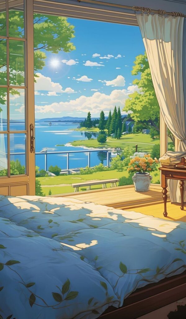 This image beautifully captures a peaceful morning by a lake, viewed from a cozy bedroom. The sunlight bathes the scene in warmth, with clear skies, lush greenery, and calm waters. The open window invites nature inside, creating a tranquil and inviting atmosphere perfect for relaxation and contemplation.