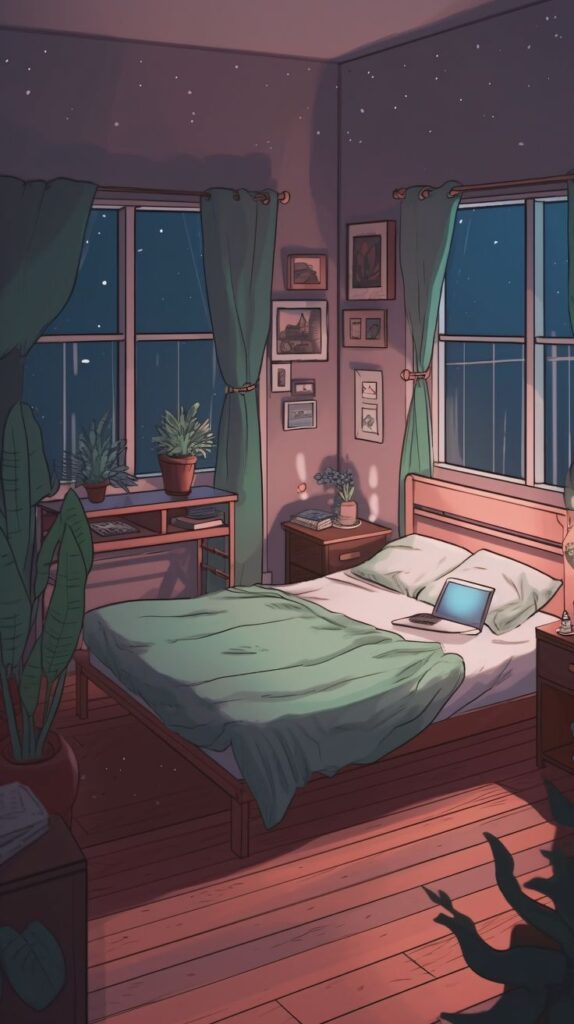 This cozy bedroom exudes a calm, lofi vibe with soft lighting and natural elements. The warm wooden floors, potted plants, and serene artwork create a peaceful atmosphere. A laptop rests on the bed, inviting relaxation or study, while the starry night outside adds to the tranquil ambiance.