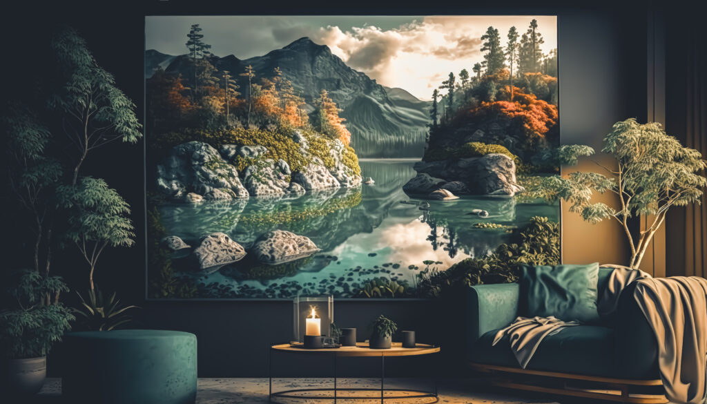 This image depicts a tranquil living room adorned with a large landscape painting of a serene lake surrounded by mountains and trees. The nature-inspired decor, soft lighting, and cozy furniture create a peaceful ambiance, blending the beauty of the outdoors with modern indoor comfort.