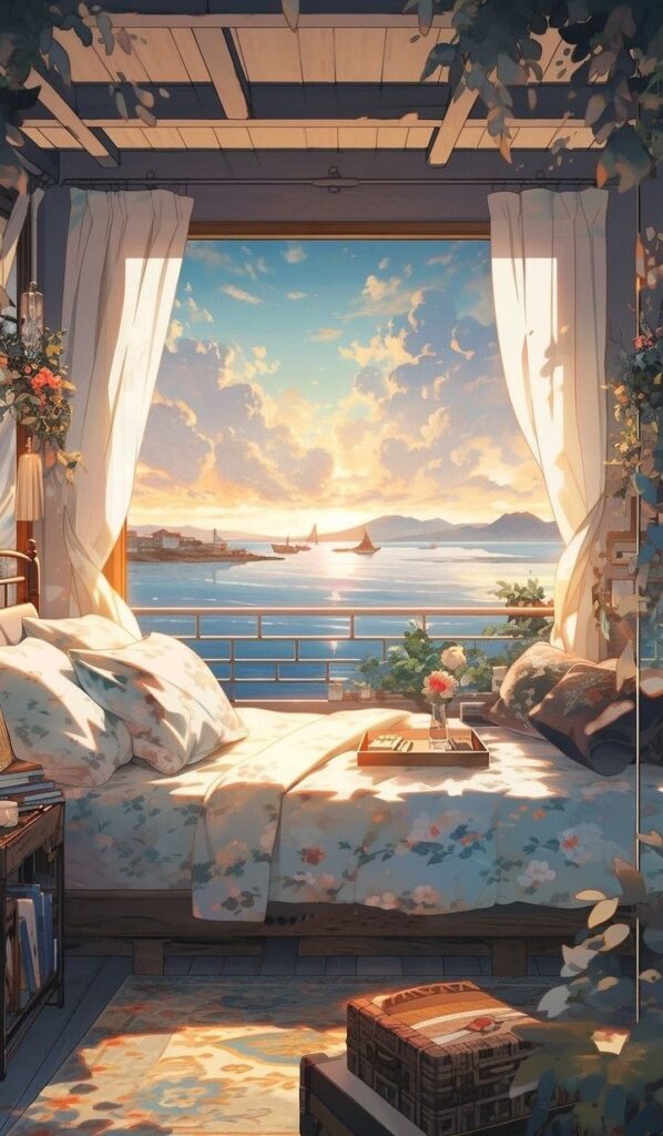 This image captures a peaceful bedroom with an open view of the sea at sunrise. The soft light filters through the curtains, illuminating the cozy bed adorned with floral sheets. Sailboats drift in the distance, creating a tranquil atmosphere perfect for relaxation and reflection by the ocean.