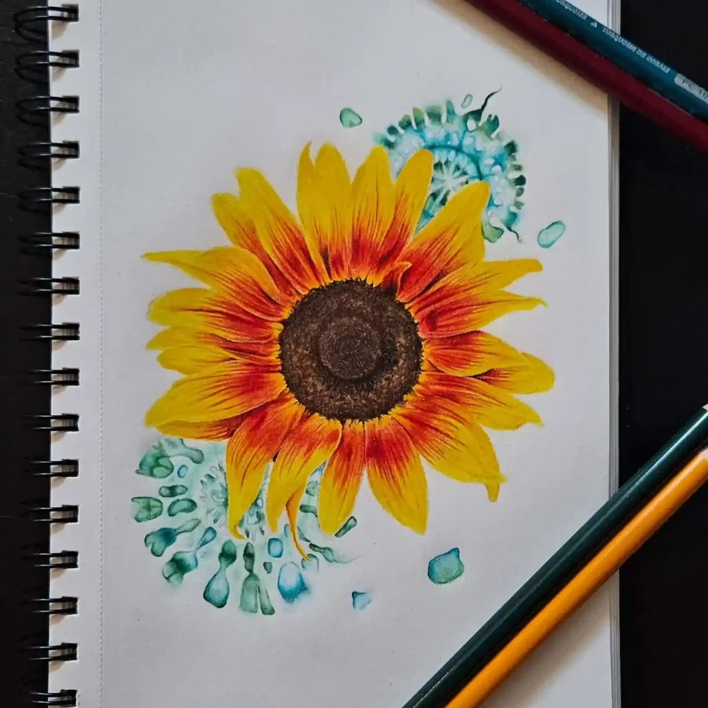 What a gorgeous and unique color palette. This mixed-media piece combines the sharp detail of colored pencils for the fiery sunflower with soft, abstract watercolor washes in the background. The contrast between the warm, blazing oranges of the flower and the cool, delicate turquoise creates a vibrant and beautifully balanced composition.
