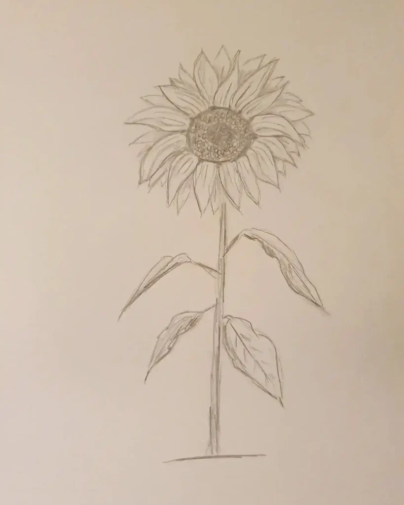 This is a great example of a fundamental flower sketch. The artist has focused on capturing the sunflower’s overall shape and structure with simple, clean pencil lines. It’s a perfect starting point for a more detailed drawing or painting, showcasing the basic forms—from the radiating petals to the tall, leafy stem—with lovely clarity.