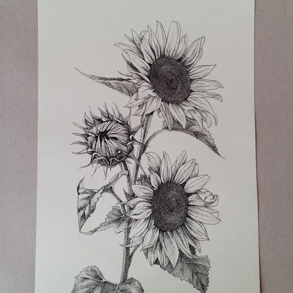This beautiful ink illustration captures the life cycle of a sunflower in one composition. The artist shows the plant in different stages, from a tightly closed bud to fully opened blooms, all rendered with incredible detail. The fine linework and stippling create a rich texture, making this a stunning and comprehensive botanical study.